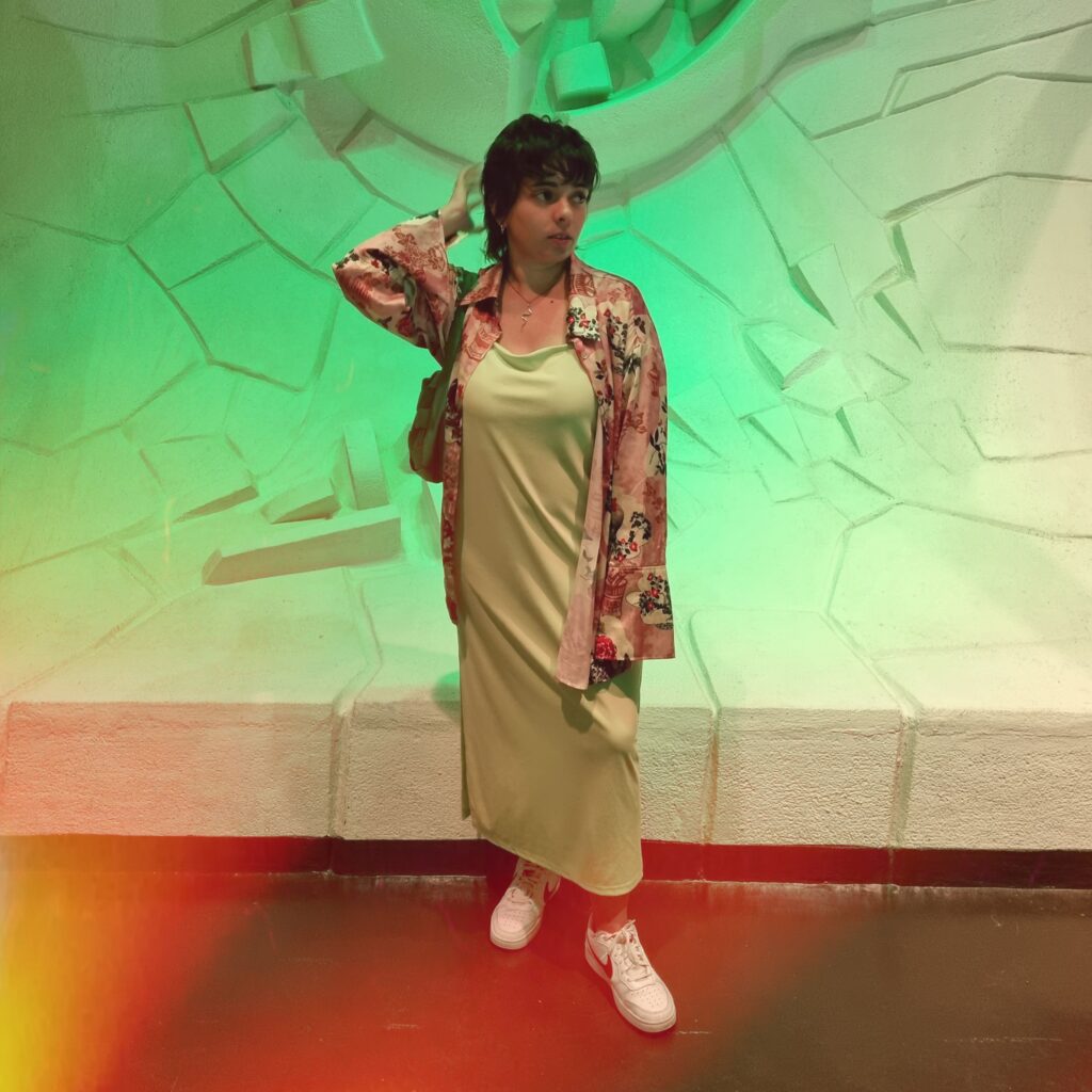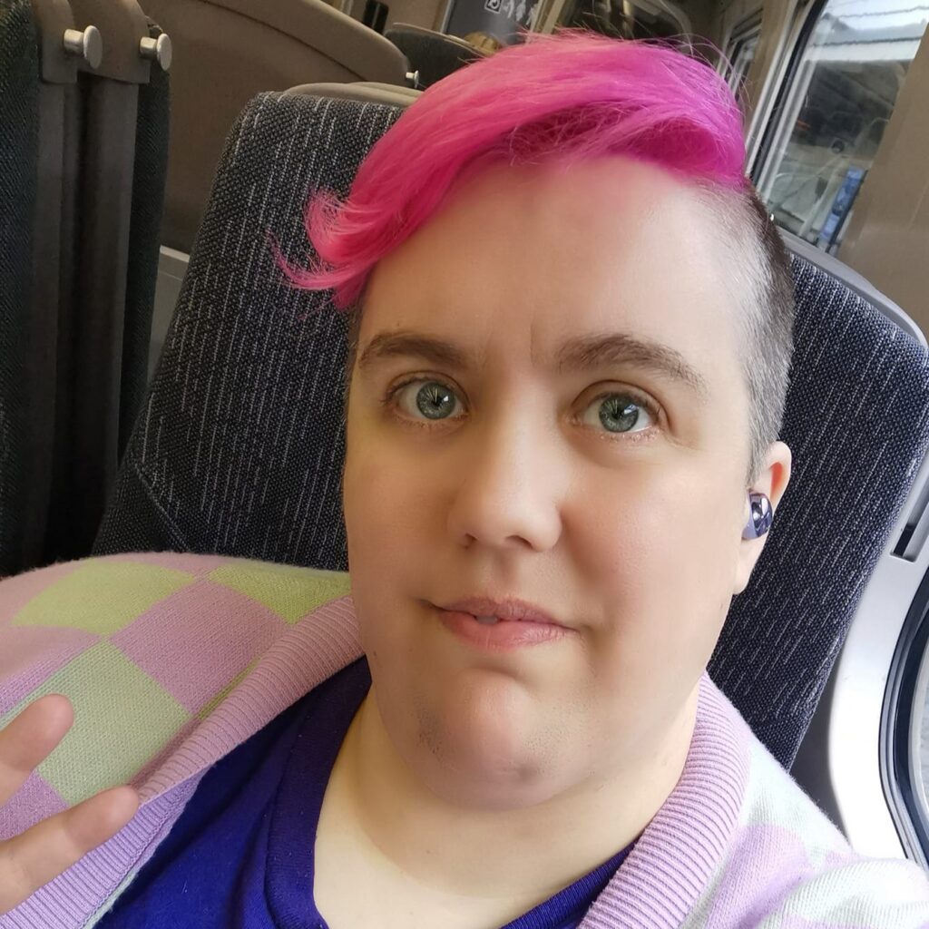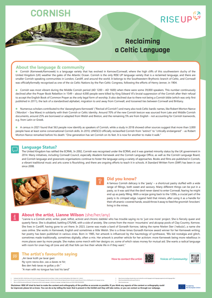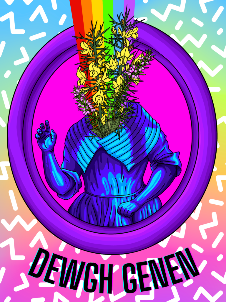 Lianne Wilson: describes herself as a Cornish artist, writer, poet, leftist, activist and chronic dabbler who has trouble saying no to ‘just one more’ project. She is fiercely queer and queerly fierce. She is disabled, battling CFS/ME, with a side of anxiety. She comes from the moon ‘mountains’ and alcopop pools of Clay Country, Kernow. She lives in Cardiff, having gone to uni there. In 2023, Lianne was made a bard of Gorsedh Kernow, taking the name Niwlen Ster (‘nebula’), a name she uses online. She works in Kernewek, English and sometimes a little Welsh. She is a three times Gorsedh Kernow award winner for her Kernewek writing; her poetry has been published in various zines and a book. Born in 1985, her artwork is influenced by the hauntology of synthwave, ‘90s kid nostalgia and glitch, sometimes made traditionally, sometimes digitally, often a mix. Her artwork is another vehicle for her activism: more Kernewek being more rebellious in more places seen by more people. She makes some merch with her designs on, some of which raises money for mutual aid. She wants a radical language with “room for onan hag oll (one and all), so that folk can live their whole life in if they want.”