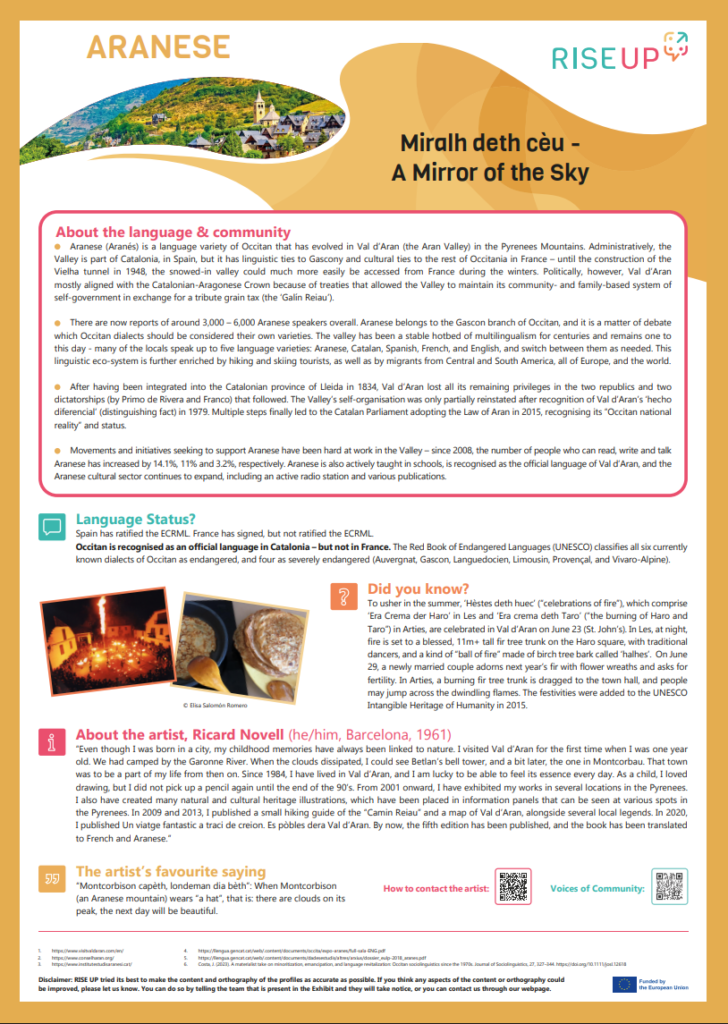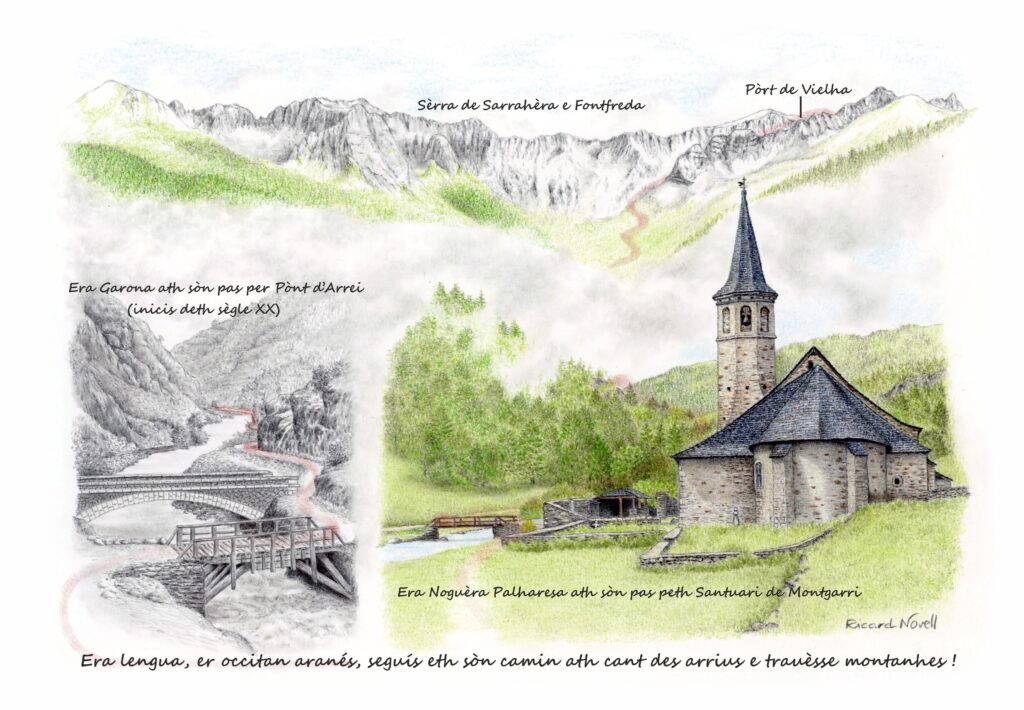 Ricard Novell (Barcelona, 1961): “Even though I was born in a city, my childhood memories have always been linked to nature. I visited Val d’Aran for the first time when I was one year old. We had camped by the Garonne River. When the clouds dissipated, I could see Betlan’s bell tower, and a bit later, the one in Montcorbau. That town was to be a part of my life from then on. I have lived in Val d’Aran since 1984, and I am lucky to be able to feel its essence every day. As a child, I loved drawing, but I did not pick up a pencil again until the end of the 90’s. From 2001 onward, I have exhibited my works in several locations in the Pyrenees. I also have created many natural and cultural heritage illustrations, which have been placed in information panels that can be seen at various spots in the Pyrenees. In 2009 and 2013, I published a small hiking guide of the “Camin Reiau” and a map of Val d’Aran, alongside several local legends. In 2020, I published Un viatge fantastic a traci de creion. Es pòbles dera Val d’Aran. By now, the fifth edition has been published, and the book has been translated to French and Aranese.”