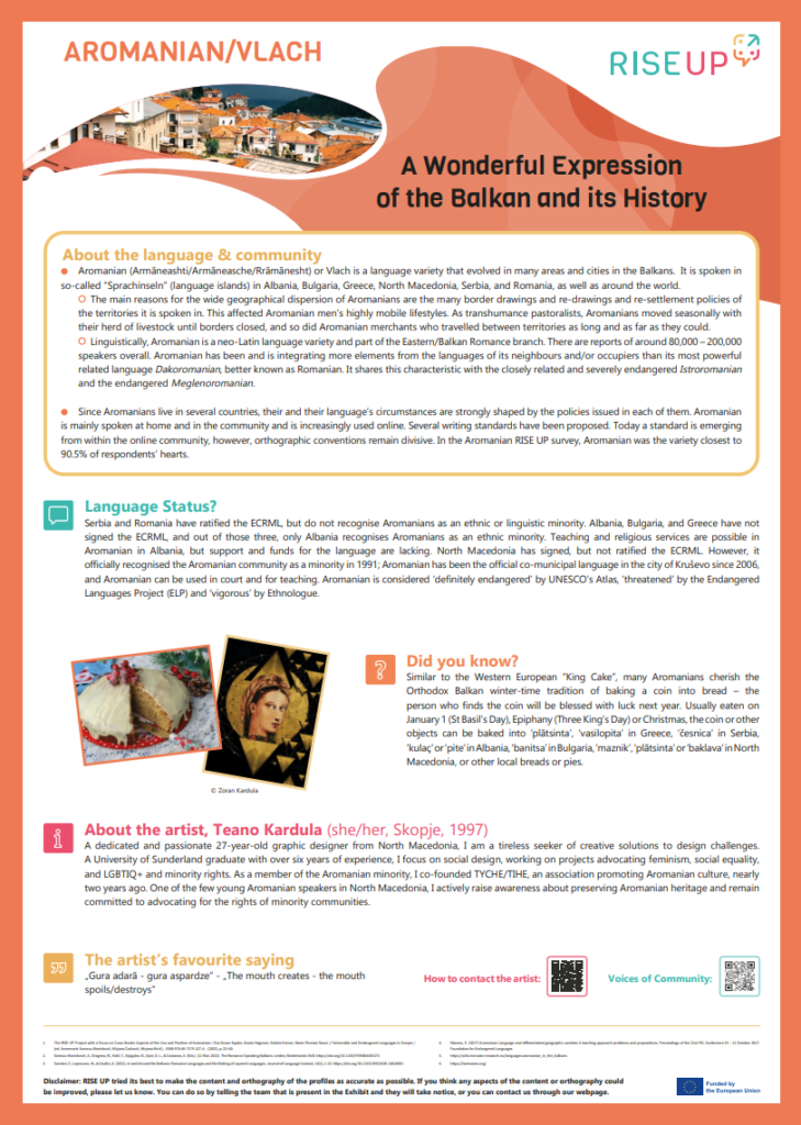 Teano Kardula (Skopje, 1997): “A dedicated and passionate 27-year-old graphic designer from North Macedonia, I am a tireless seeker of creative solutions to design challenges. A University of Sunderland graduate with over six years of experience, I focus on social design, working on projects advocating feminism, social equality, and LGBTIQ+ and minority rights. As a member of the Aromanian minority, I co-founded TYCHE/TIHE, an association promoting Aromanian culture, nearly two years ago. One of the few young Aromanian speakers in North Macedonia, I actively raise awareness about preserving Aromanian heritage and remain committed to advocating for the rights of minority communities.”
